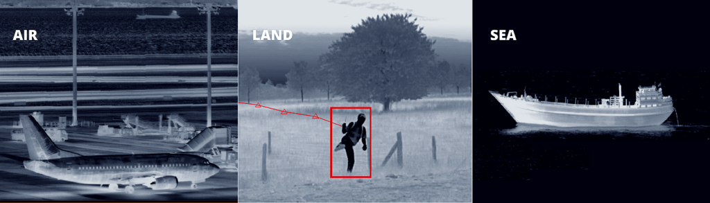 • Confini e frontiere: sorveglianza passiva su ampie estensioni territoriali con rilevamento automatico di attraversamenti non autorizzati, efficace anche in condizioni ambientali estreme.