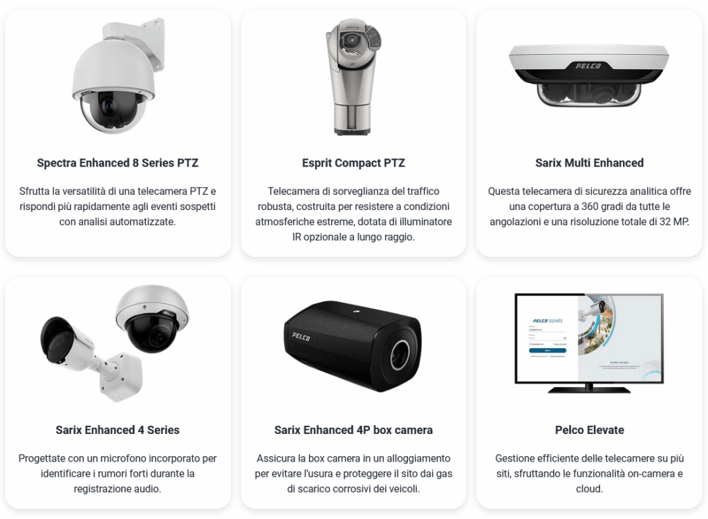 1. Monitoraggio Intelligente e Analisi Avanzata: le telecamere Pelco sono dotate di analisi video AI che permettono di rilevare movimenti specifici, monitorare il flusso di veicoli e pedoni, e generare alert automatici per una gestione proattiva degli incidenti.